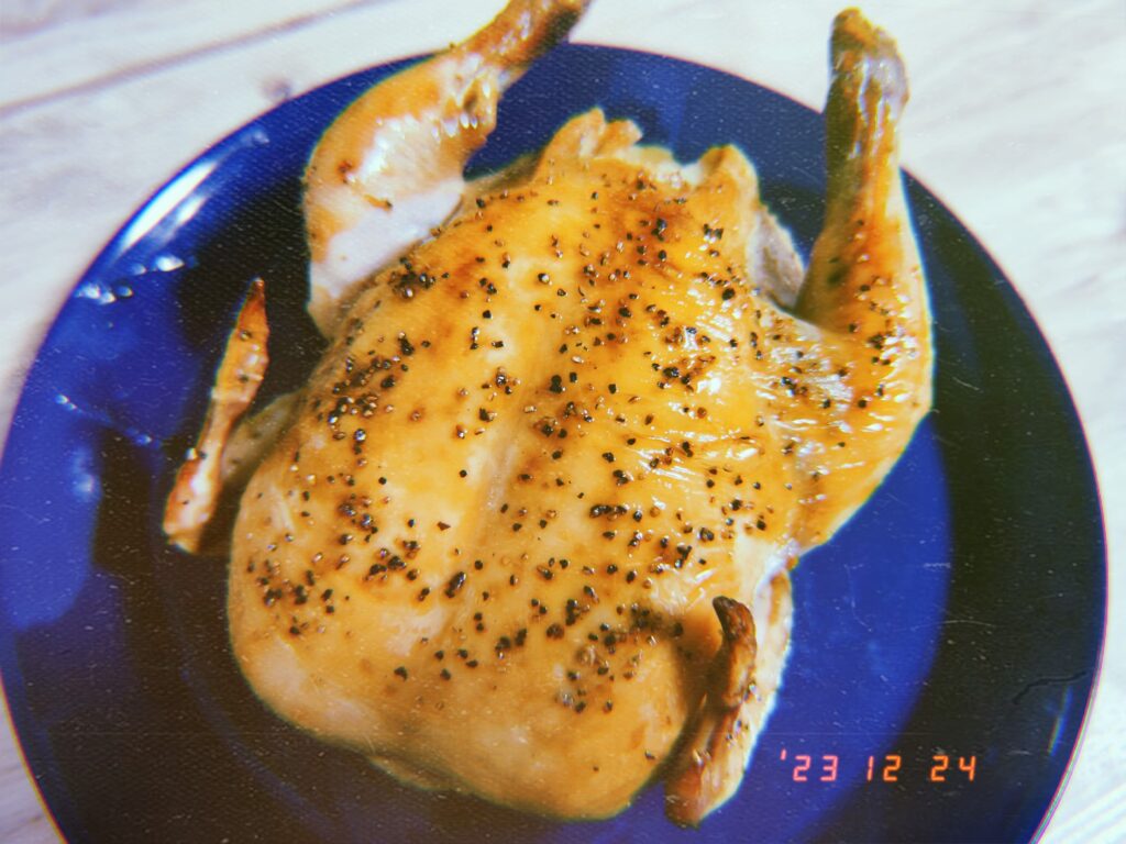 クリスマスにNが丸鷄を焼いてくれた。丸鷄は「生き物だった」ことがかなり残っていてちょっと怖かった。丸鷄をオーブンで焼いたものを初めて食べた。美味しかった。丸鷄が潰れないよう、中に詰めたジャガイモも美味しかった。
